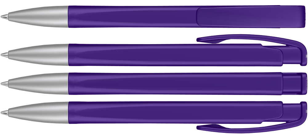 Druckkugelschreiber mit geometrisch wechselnder Schaftform, matt gedecktem Gehäuse und Metallspitze matt verchromt.