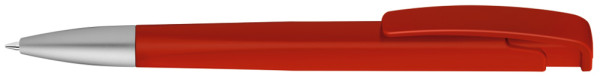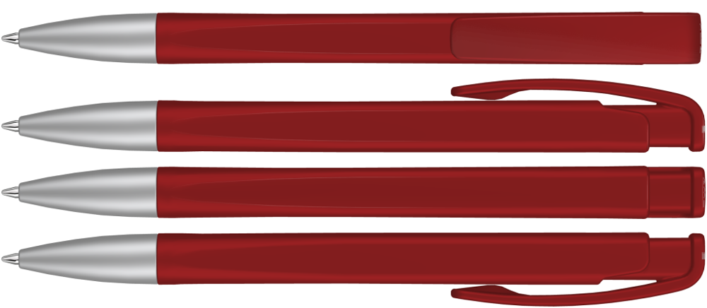 Druckkugelschreiber mit geometrisch wechselnder Schaftform, matt gedecktem Gehäuse und Metallspitze matt verchromt.
