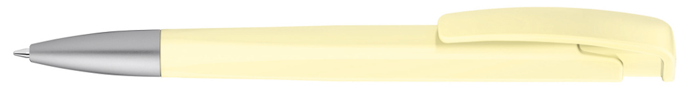Druckkugelschreiber mit geometrisch wechselnder Schaftform, matt gedecktem Gehäuse und Metallspitze matt verchromt.