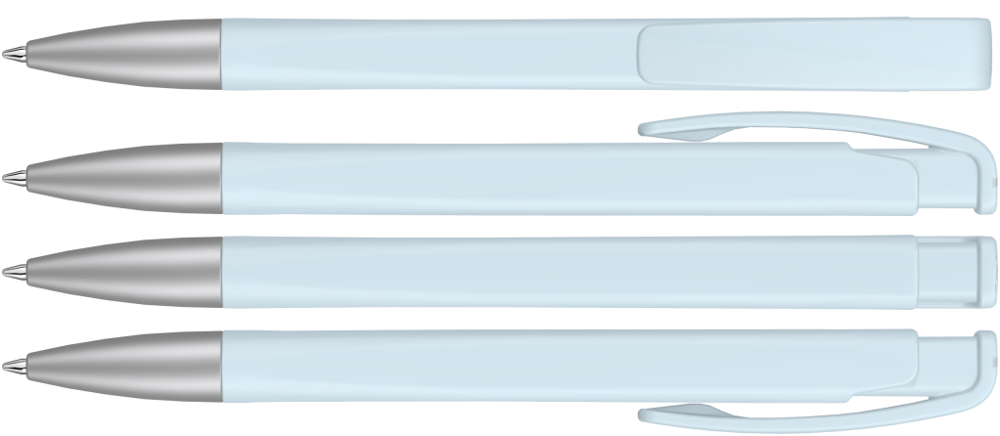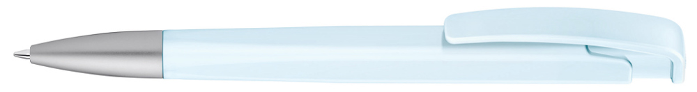 Druckkugelschreiber mit geometrisch wechselnder Schaftform, matt gedecktem Gehäuse und Metallspitze matt verchromt.