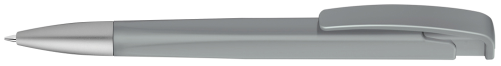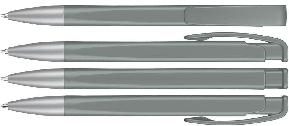 Druckkugelschreiber mit geometrisch wechselnder Schaftform, matt gedecktem Gehäuse und Metallspitze matt verchromt.