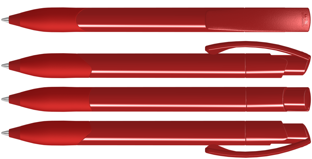 Druckkugelschreiber mit gedeckt glänzendem Schaft und Clipdrücker in weiß. Gummigriffzone und Manschette farbig.
