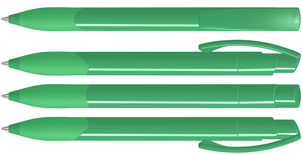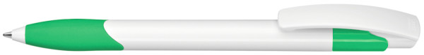 Druckkugelschreiber mit gedeckt glänzendem Schaft und Clipdrücker in weiß. Gummigriffzone und Manschette farbig.