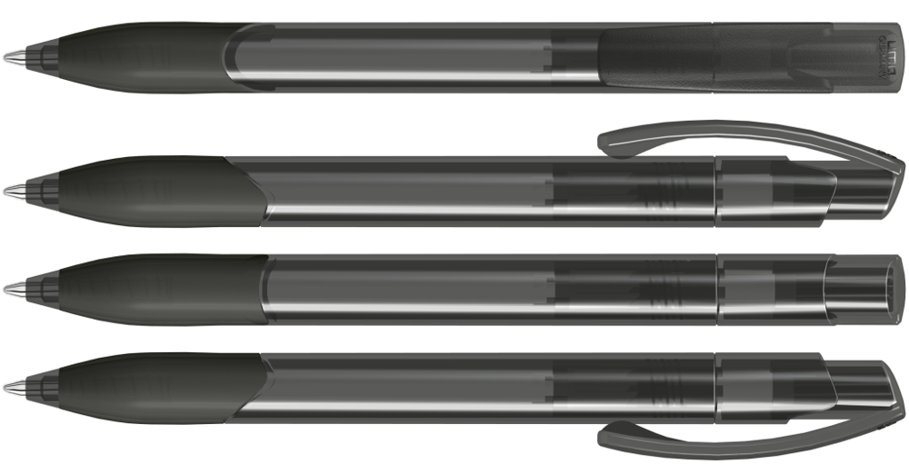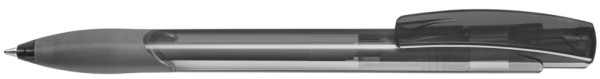 Druckkugelschreiber mit transparent glänzendem Schaft, Gummigriffzone und Clipdrücker.