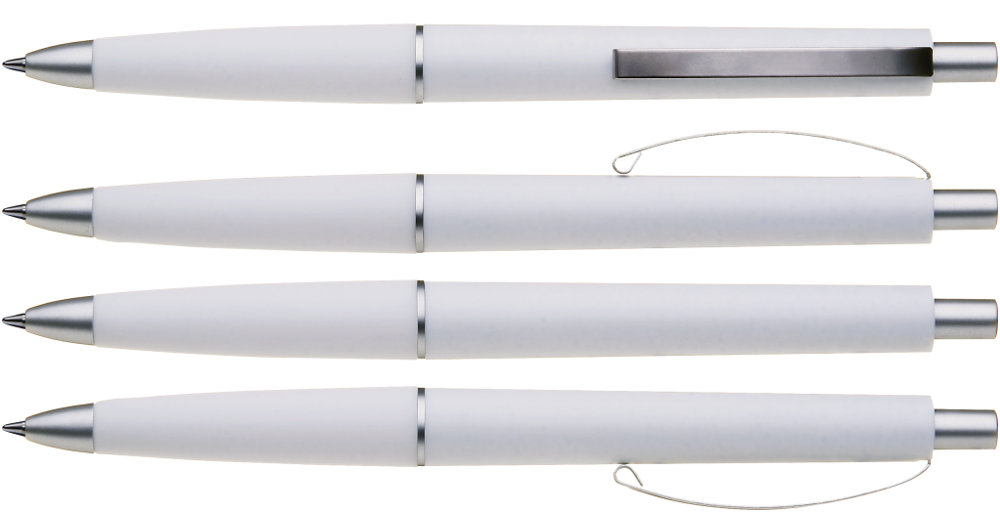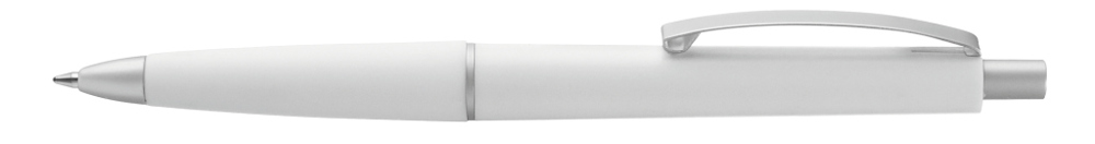 Druckkugelschreiber mit gedecktem Gehäuse, Gummigriffzone und geschwungenem Metallclip. Drücker, Zierring und Spitze in matt silber.