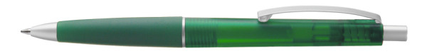 Druckkugelschreiber mit transparent gefrostetem Gehäuse, Gummigriffzone und geschwungenem Metallclip. Drücker, Zierring und Spitze in matt silber.