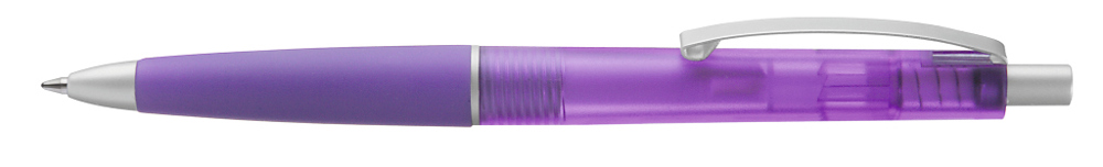 Druckkugelschreiber mit transparent gefrostetem Gehäuse, Gummigriffzone und geschwungenem Metallclip. Drücker, Zierring und Spitze in matt silber.