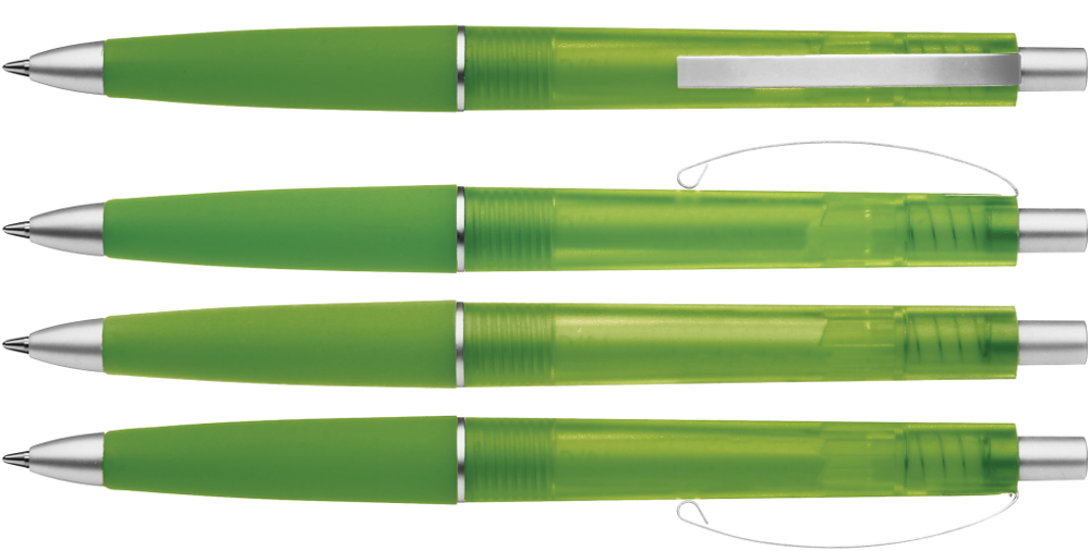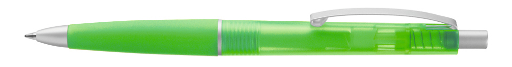 Druckkugelschreiber mit transparent gefrostetem Gehäuse, Gummigriffzone und geschwungenem Metallclip. Drücker, Zierring und Spitze in matt silber.