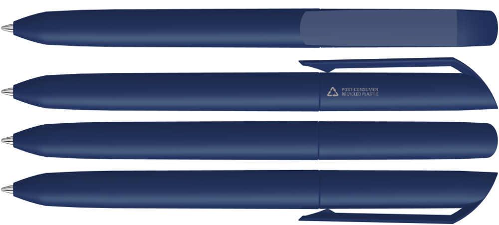 Drehkugelschreiber mit gedeckt mattem Gehäuse und Clip aus 100% recyceltem Post-Consumer-Kunststoff.