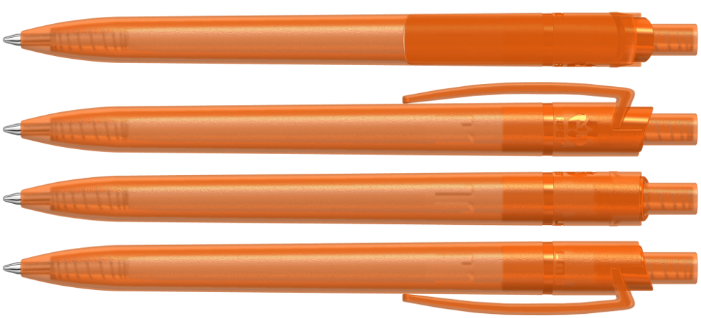Druckkugelschreiber aus recyceltem PET-Material mit transparent gefrostetem Gehäuse, Clip und Drücker.