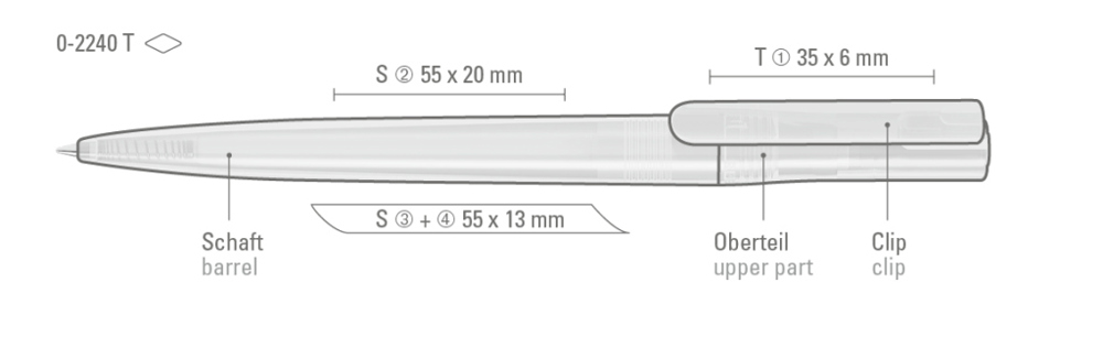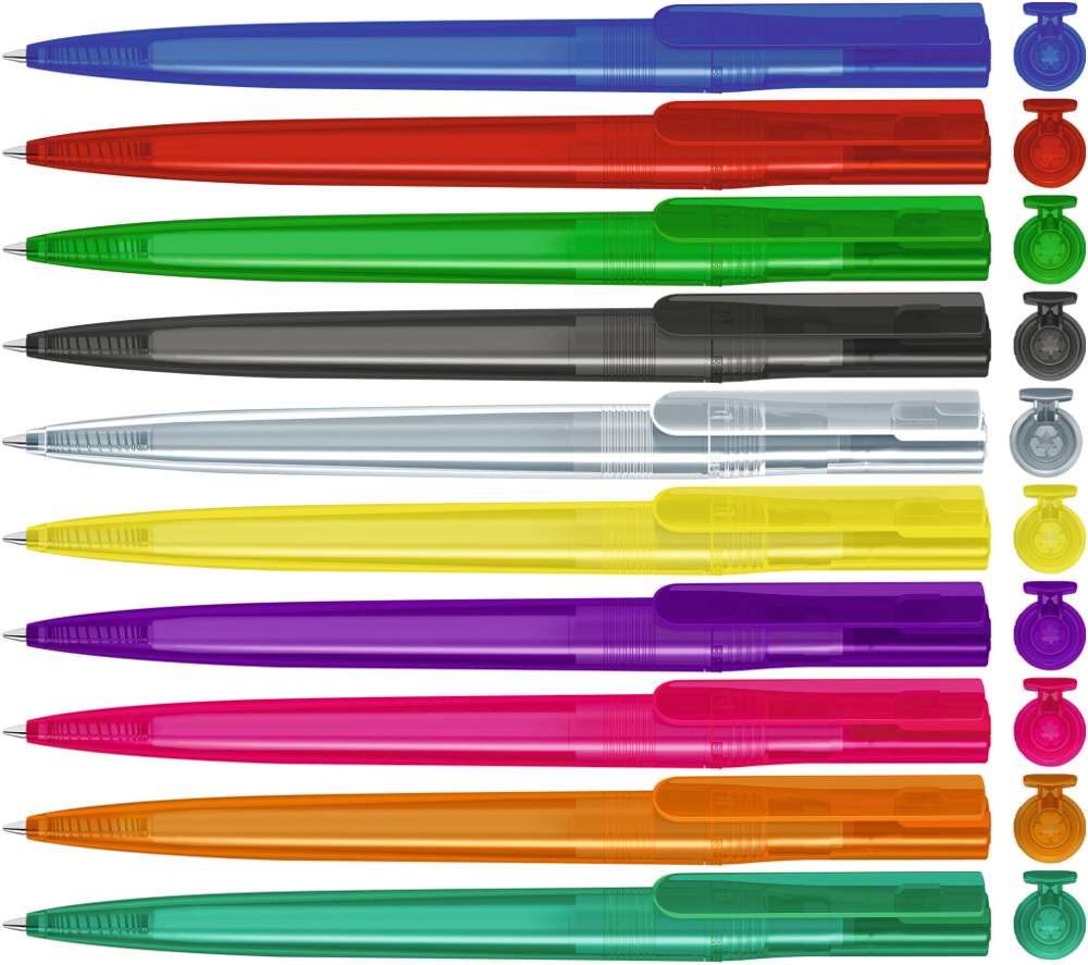 Drehkugelschreiber aus recyceltem PET-Material mit transparent glänzendem Gehäuse.