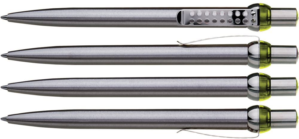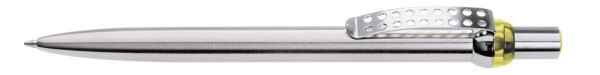 Metall-Druckkugelschreiber mit verchromtem und lackiertem Schaft. Obere Halbkugel und Stopfen farbig transparent. Gelochter Metallclip, Drücker und untere Halbkugel verchromt.