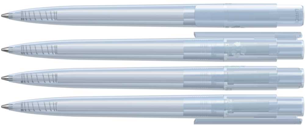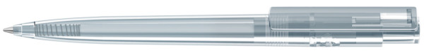 Druckkugelschreiber aus recyceltem PET-Material mit transparent glänzendem Gehäuse und Clip.