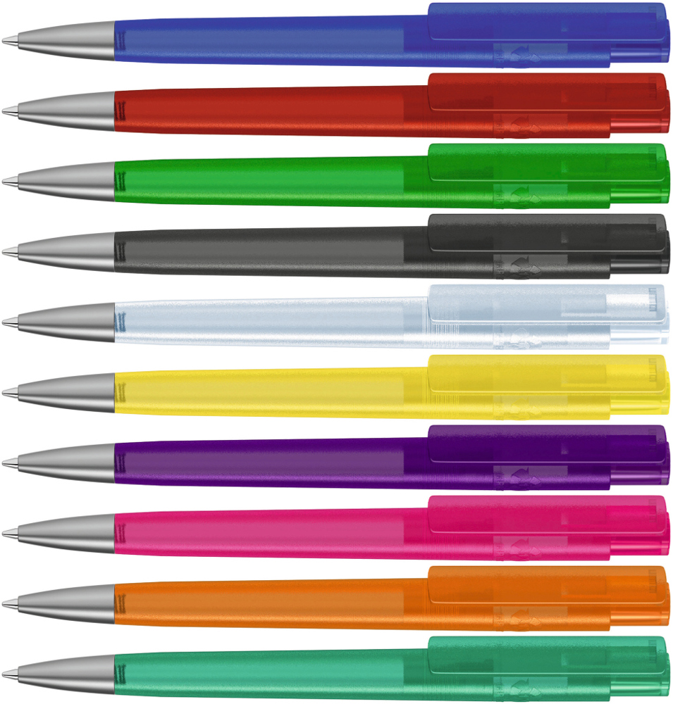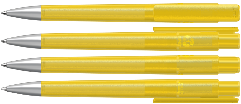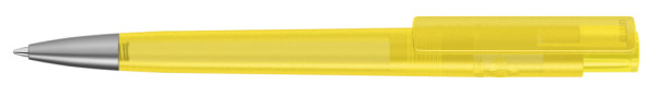 Druckkugelschreiber aus recyceltem PET-Material mit transparent gefrostetem Gehäuse und Clip sowie Metallspitze aus recyceltem Aluminium in silber matt.