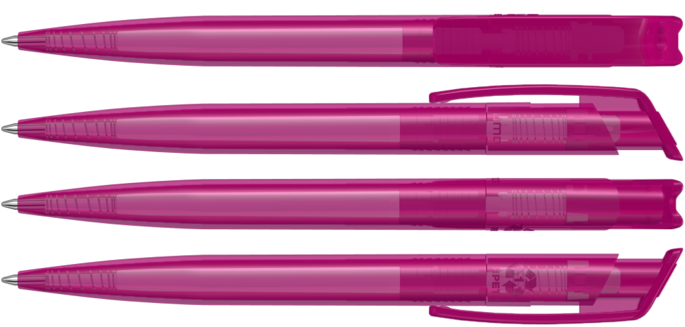 Druckkugelschreiber aus recyceltem PET-Material mit transparent glänzendem Gehäuse und gedecktem Stopfen.