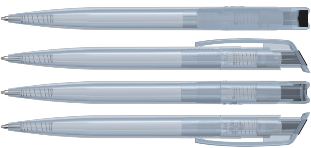 Druckkugelschreiber aus recyceltem PET-Material mit klar transparent glänzendem Gehäuse und gedecktem Stopfen.