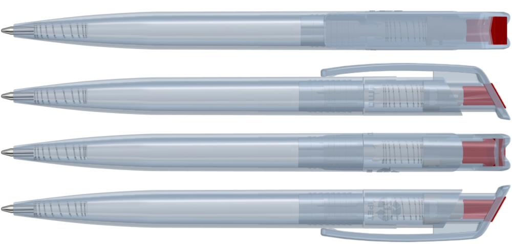 Druckkugelschreiber aus recyceltem PET-Material mit klar transparent glänzendem Gehäuse und gedecktem Stopfen.