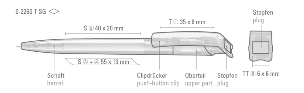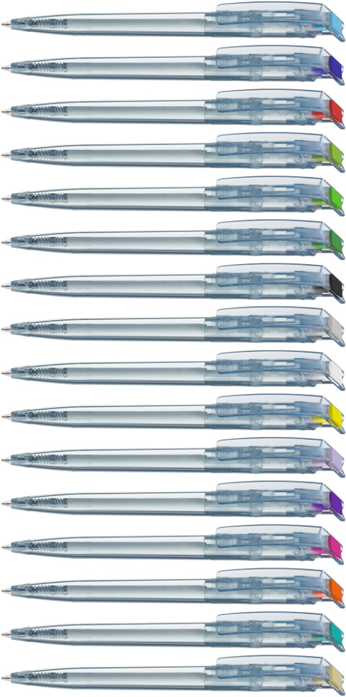 Druckkugelschreiber aus recyceltem PET-Material mit klar transparent glänzendem Gehäuse und gedecktem Stopfen.