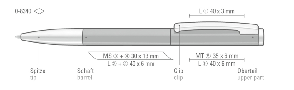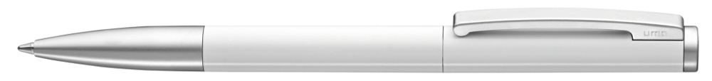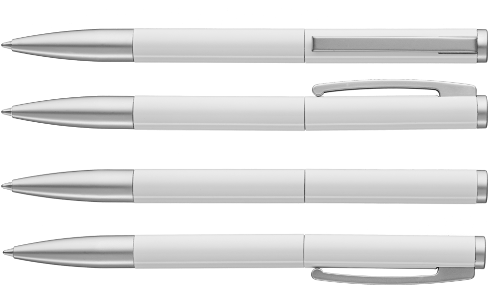Metall-Drehkugelschreiber mit gefedertem Clip. Oberfläche in silber matt mit glänzenden Beschlagteilen oder schwarz bzw. weiß glänzend mit matten Beschlägen.