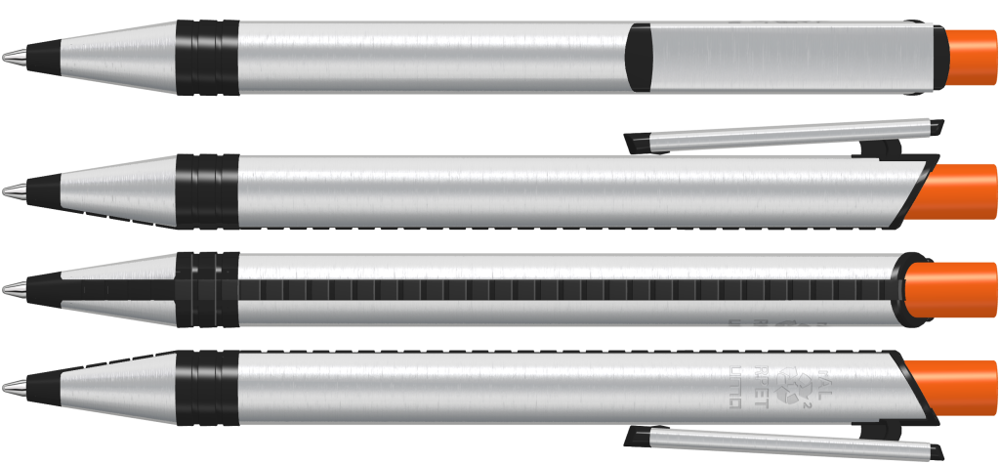 Metall-Druckkugelschreiber mit Metallspitze, Metallschaft und Metallclip aus recyceltem Aluminium, Kunststoffteile aus recyceltem PET-Material in gedeckt schwarz und gedeckt farbigem Drücker.