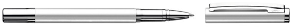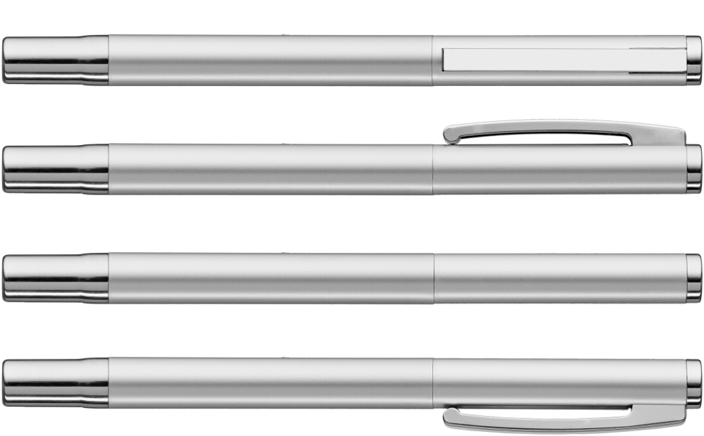 Metall-Rollerball mit gefedertem Clip. Oberfläche in silber matt mit glänzenden Beschlagteilen oder schwarz bzw. weiß glänzend mit matten Beschlägen.