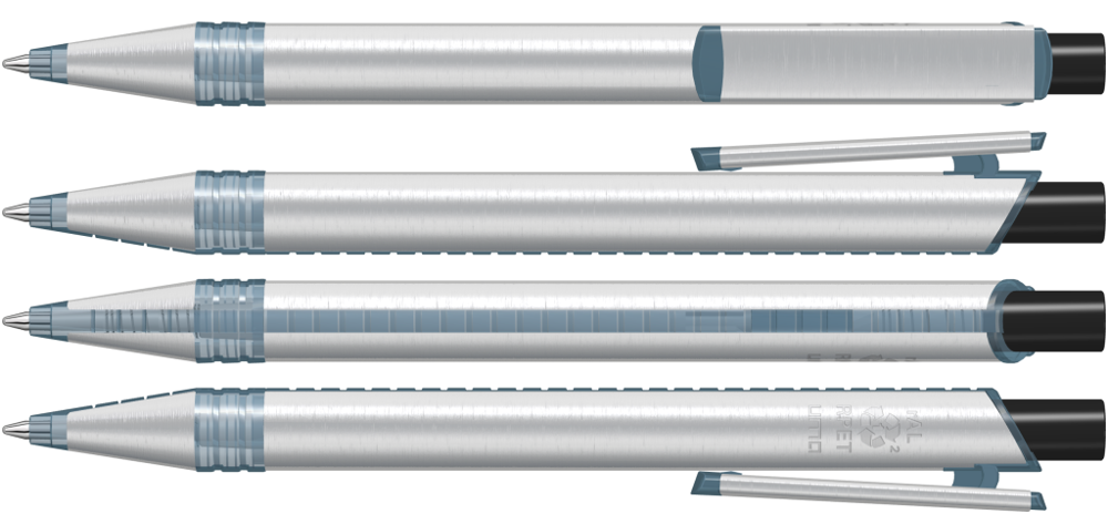 Metall-Druckkugelschreiber mit Metallspitze, Metallschaft und Metallclip aus recyceltem Aluminium, Kunststoffteile aus recyceltem PET-Material in klar transparent und gedeckt farbigem Drücker.