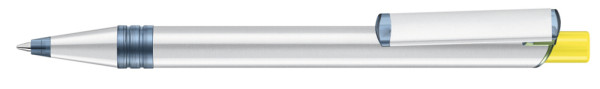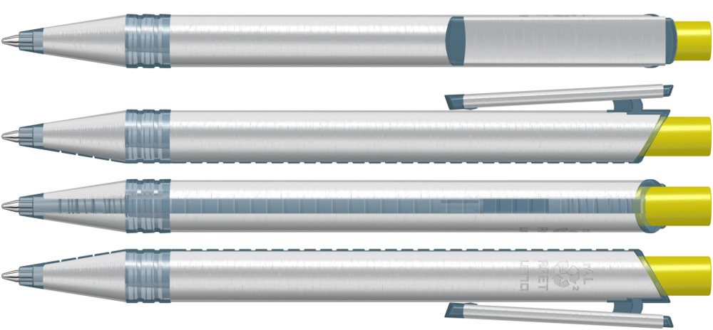 Metall-Druckkugelschreiber mit Metallspitze, Metallschaft und Metallclip aus recyceltem Aluminium, Kunststoffteile aus recyceltem PET-Material in klar transparent und gedeckt farbigem Drücker.
