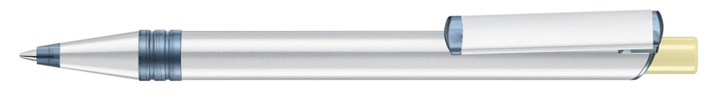 Metall-Druckkugelschreiber mit Metallspitze, Metallschaft und Metallclip aus recyceltem Aluminium, Kunststoffteile aus recyceltem PET-Material in klar transparent und gedeckt farbigem Drücker.