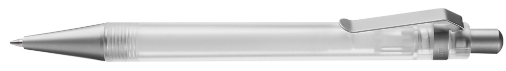 Druckkugelschreiber mit transparent gefrostetem oder gedecktem Gehäuse. Metalldrücker, Metallclip und Metallspitze matt verchromt.