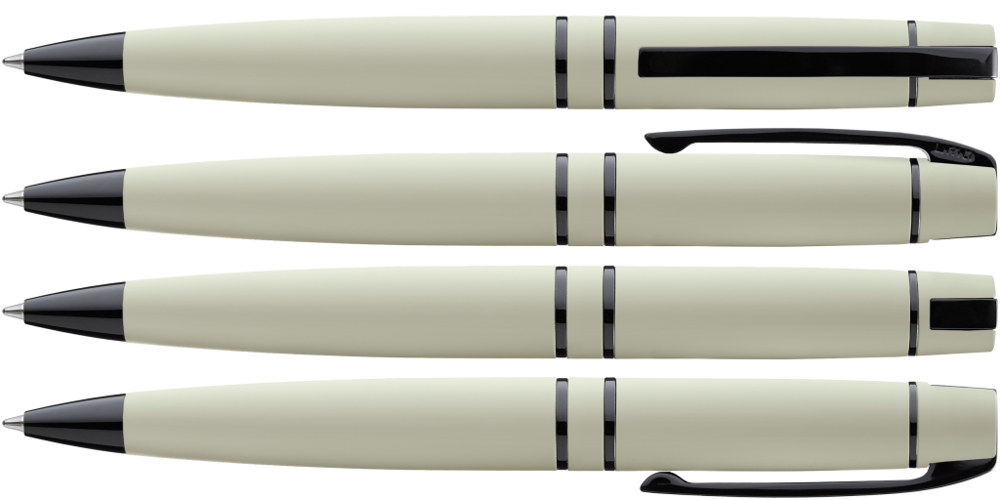 Metall-Drehkugelschreiber mit Softtouch-Gehäuse, Softdrehmechanik und gefedertem Clip. Beschlagteile schwarz glänzend lackiert.