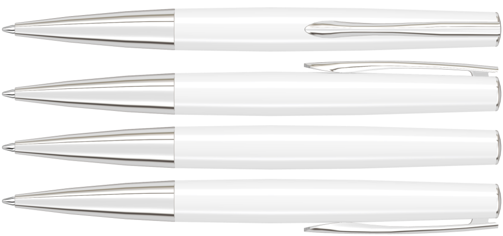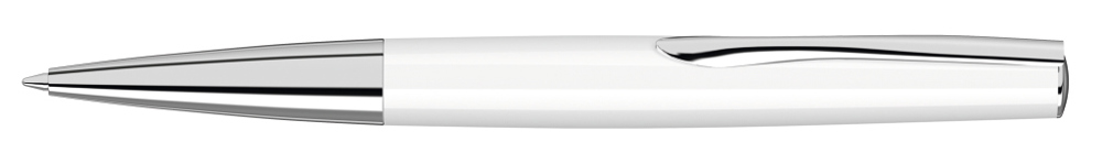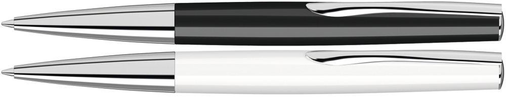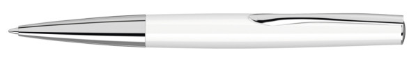 Metall-Drehkugelschreiber mit gedeckt glänzendem Schaft in schwarz oder weiß, gefederter Metallclip, Stopfen, schwere Metallspitze glanzverchromt und Softdrehmechanik.