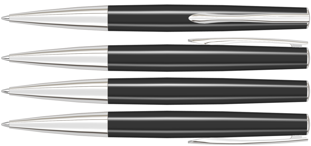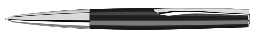 Metall-Drehkugelschreiber mit gedeckt glänzendem Schaft in schwarz oder weiß, gefederter Metallclip, Stopfen, schwere Metallspitze glanzverchromt und Softdrehmechanik.