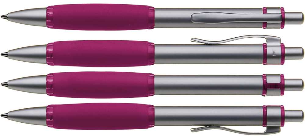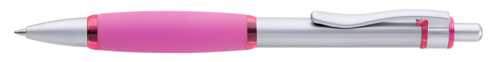 Metall-Druckkugelschreiber mit Schaft, Drücker, Clip und Spitze glanzverchromt. Große, farbige Gummigriffzone.