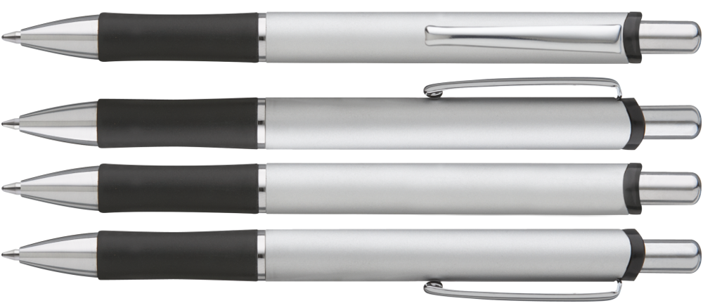 Metall-Druckkugelschreiber mit lackiertem Aluminiumschaft. Schwarzer Gummigriffzone und Metallclip.