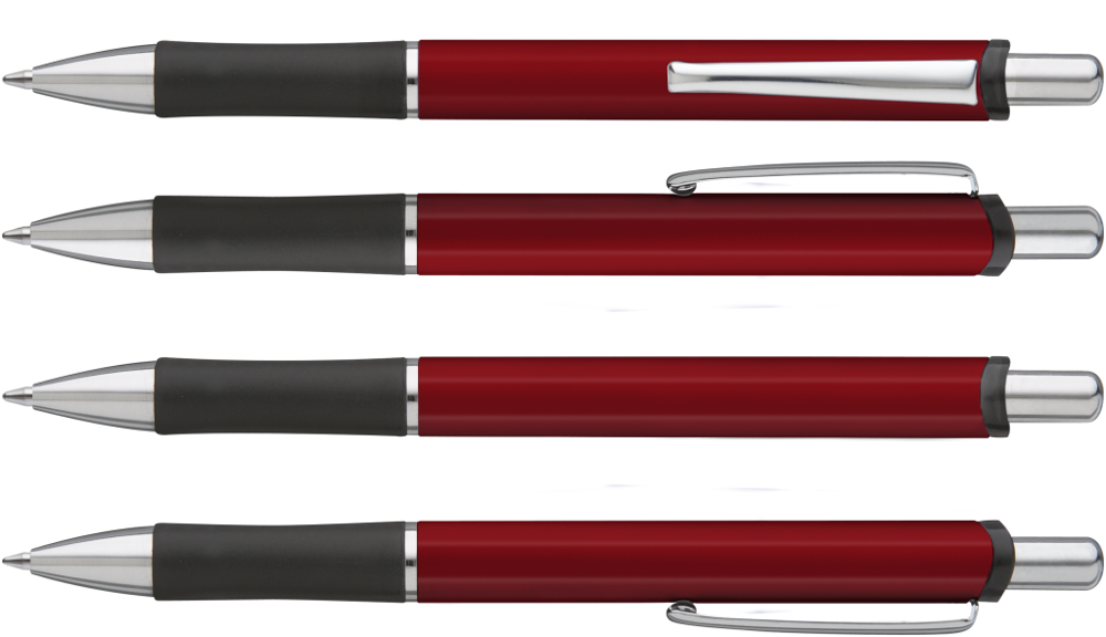 Metall-Druckkugelschreiber mit lackiertem Aluminiumschaft. Schwarzer Gummigriffzone und Metallclip.