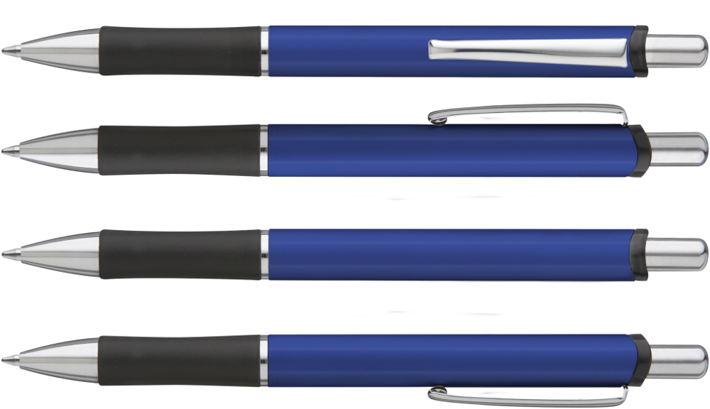 Metall-Druckkugelschreiber mit lackiertem Aluminiumschaft. Schwarzer Gummigriffzone und Metallclip.