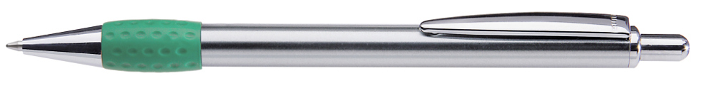 Metall-Druckkugelschreiber mit Schaft, Drücker, Clip und Spitze glanzverchromt. Gummigriffzone farbig.