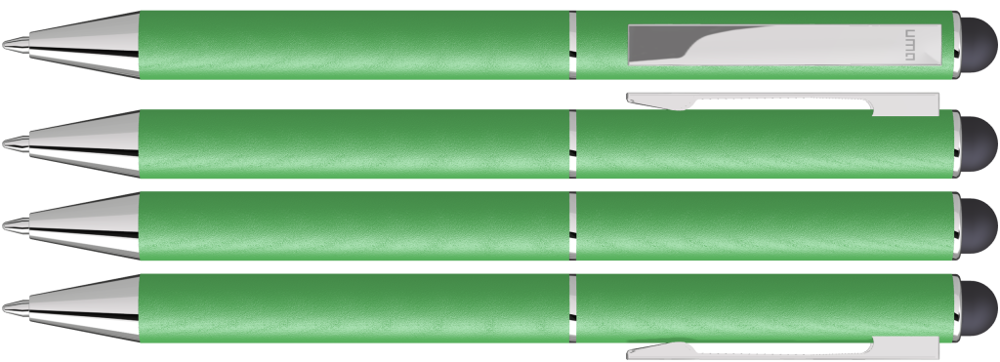 Metall-Drehkugelschreiber mit mattem Gehäuse. Metallclip und Metallspitze silber glänzend. Gummiertes Schaftende für die Touchscreensteuerung.