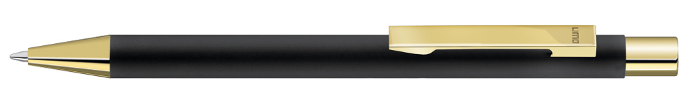 Metall-Druckkugelschreiber mit mattem Gehäuse in weiß oder schwarz. Metallclip, Metallspitze und Drücker gold glänzend.