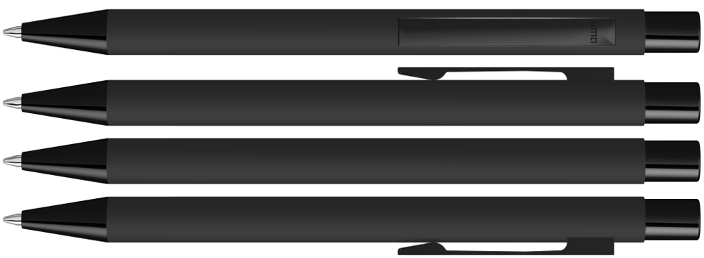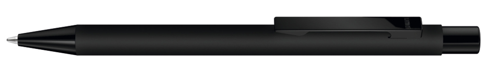Metall-Druckkugelschreiber mit Softtouch-Gehäuse. Metallclip, Metallspitze und Drücker schwarz glänzend.
