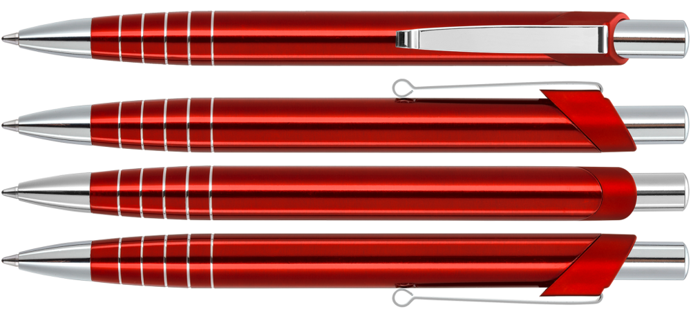 Metall-Druckkugelschreiber mit silbernen Zierringen im Gehäuse und elastischem Metallclip. Spitze und Drücker silber glänzend.