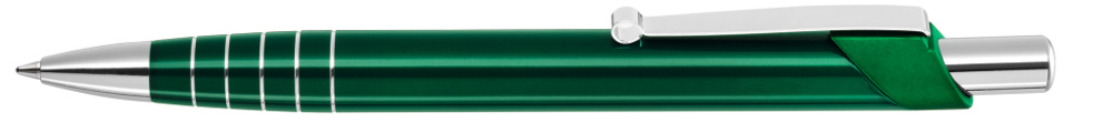 Metall-Druckkugelschreiber mit silbernen Zierringen im Gehäuse und elastischem Metallclip. Spitze und Drücker silber glänzend.