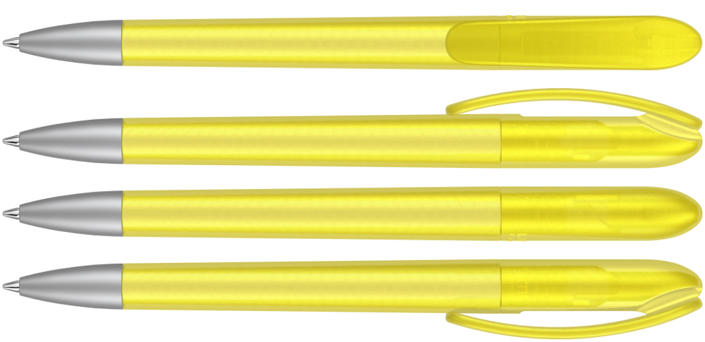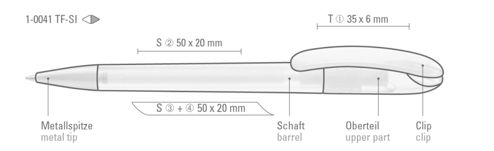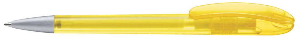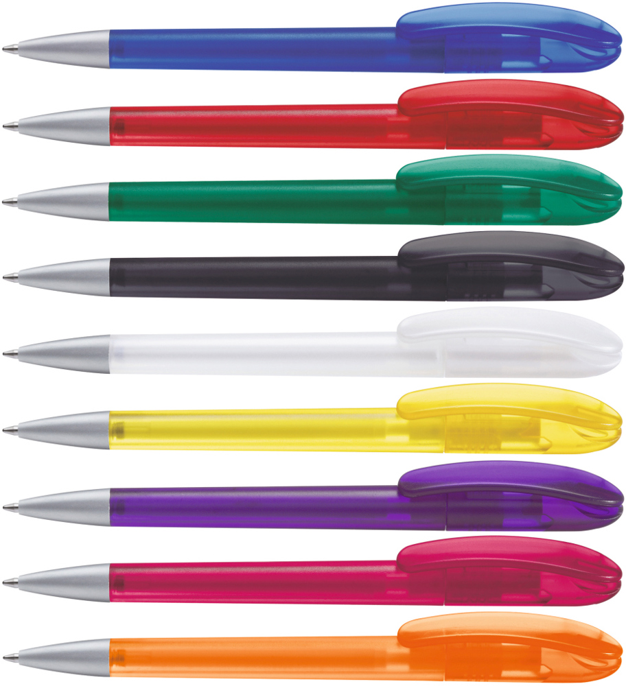 Drehkugelschreiber mit transparent gefrostetem Gehäuse. Schwere matt verchromte Metallspitze. mehr