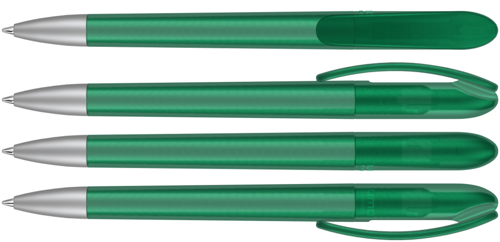 Drehkugelschreiber mit transparent gefrostetem Gehäuse. Schwere matt verchromte Metallspitze. mehr