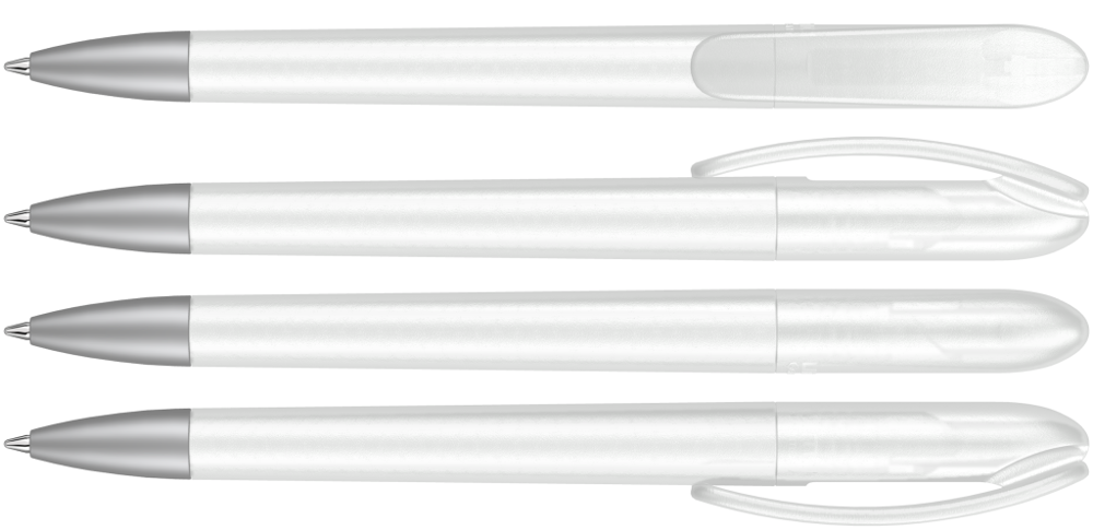 Drehkugelschreiber mit transparent gefrostetem Gehäuse. Schwere matt verchromte Metallspitze. mehr