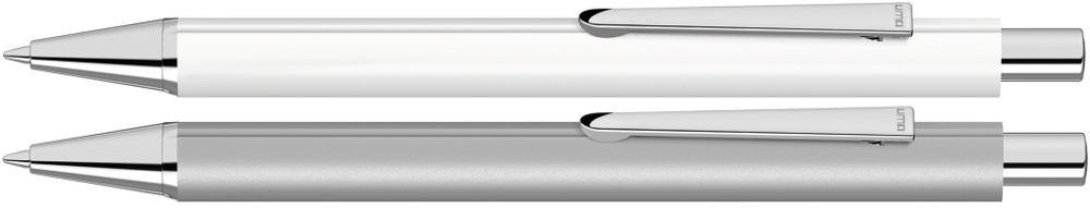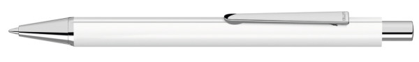 Metall-Druckkugelschreiber mit mattem Dreikantgehäuse, Metallclip, Metallspitze und Drücker in silber glänzend.