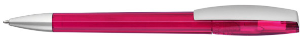 Drehkugelschreiber mit transparent glänzendem Gehäuse. Metallclip und schwere Metallspitze matt verchromt.
