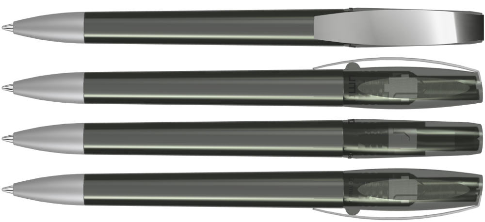 Drehkugelschreiber mit transparent glänzendem Gehäuse. Metallclip und schwere Metallspitze matt verchromt.