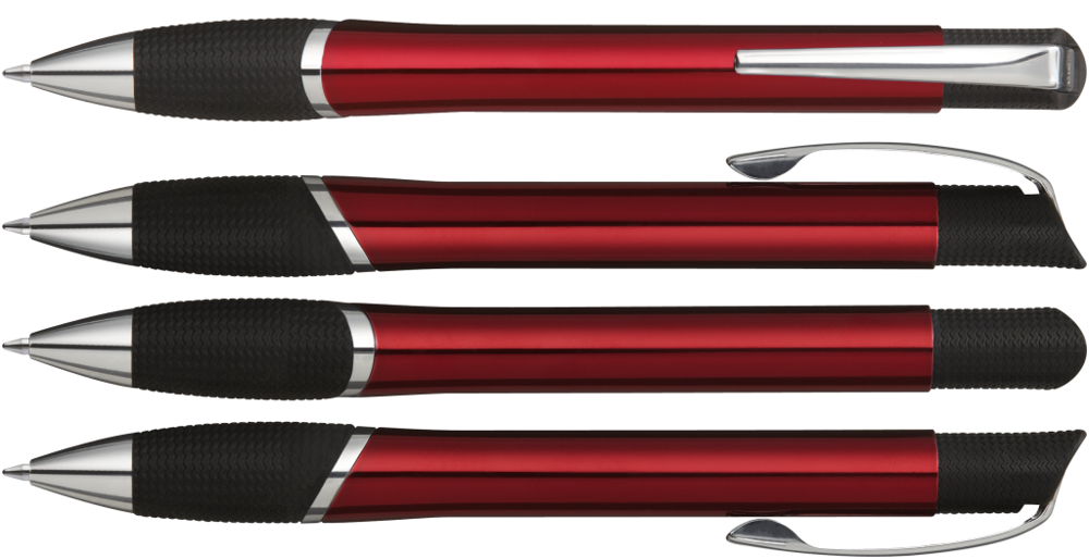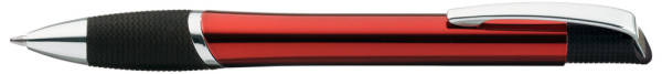 Metall-Druckkugelschreiber mit glänzendem Gehäuse, schwarzer Gummigriffzone und glanzverchromten Beschlagteilen.