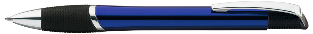 Metall-Druckkugelschreiber mit glänzendem Gehäuse, schwarzer Gummigriffzone und glanzverchromten Beschlagteilen.